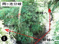 | 難所を抜けると緩やかな登山道になるが、相変わらず滑りやすい泥濘の登山道だ。泥濘を抜けると、ススキに覆われた登山道が立ちはだかる。「登山道はどっちだ」と地図を見ながら呟く。左方向に歩くのがベストと判断し、レットを抱っこしてススキブッシュと戦いながら雨ヶ池を目指す。ブッシュ状態から脱出すると直ぐに小池(裏雨ヶ池とも言う)に出会う。小池の縁に沿って左右に踏み跡があるが、標識も目印テープもない。迷ったが地図を頼りに左折する。 |