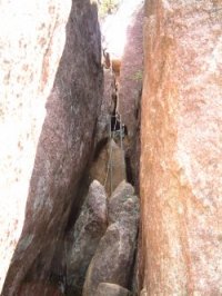 狭い巨石の間をロープと 梯子で登る。 |